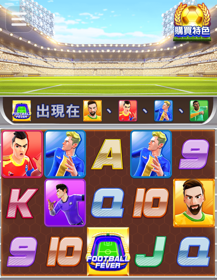 遊戲符號設計相當豐富,除了傳統的數字與字母圖示外,更加入了多位不同球衣色系的球星角色,每一個表情與姿態都帶著張力與動感。我覺得最吸睛的是「FOOTBALL FEVER」球場圖案,明亮鮮黃設計不僅成為全場焦點,更象徵著觸發特殊獎勵的關鍵元素。