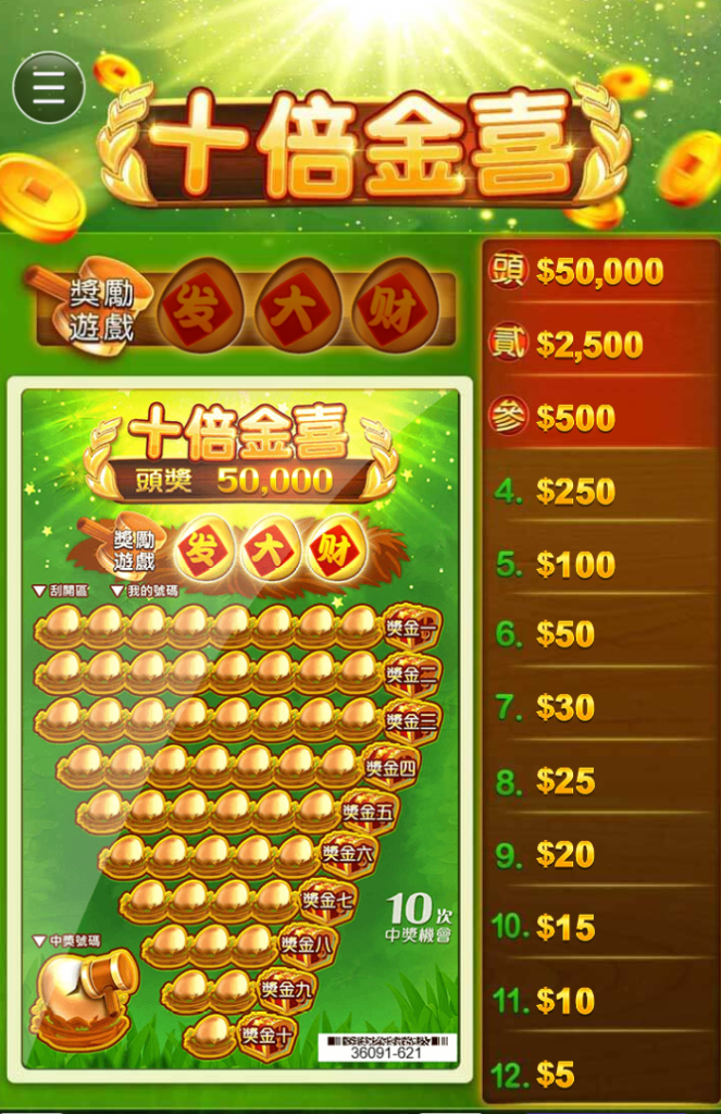 除了基本中獎外,《十倍金喜》還設計了「發大財」圖標蒐集功能,當玩家在「我的號碼」區刮出「發」、「大」、「財」三字時,便可開啟一場額外的獎勵遊戲。這個機制讓遊戲節奏更活潑,也讓整體中獎機會不再只侷限於前10次的數字比對,而是增添一層蒐集與成就感的玩法。我覺得這點設計非常巧妙,能大大提升黏著度,讓玩家更願意投入多輪嘗試。