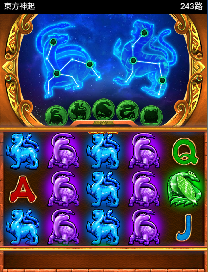 畫面中由五種東方神獸構成的符號充滿張力,搭配243線的高連線路數,不僅提升了整體中獎頻率,也讓每一輪旋轉都充滿可能性。亮眼的紫光與藍光神獸圖騰,宛如點亮宇宙的傳說生物,令人目不轉睛。背景星空搭配古銅金邊框設計,更突顯了這款遊戲的東方古韻與現代科技的融合。
