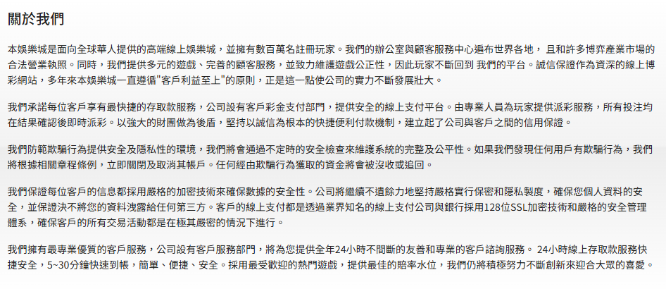 並且他們提到擁有「國際營運經驗與客服中心遍布世界各地」,這其實解釋了為什麼他們能提供穩定的24小時即時客服與儲值提款服務,並且支援多種語系與貨幣,在服務的延展性與規模上,是很多台灣在地娛樂城還無法相比的。