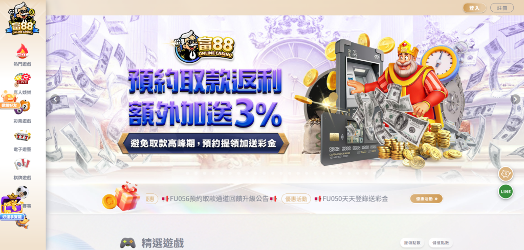 一進入首頁,畫面相當清爽有質感,該有的分類一目了然,不像某些平台按鈕多到讓人眼花撩亂。富88娛樂城把重點資訊例如熱門遊戲、優惠活動、客服聯繫方式都安排在很直覺的位置,完全不用花時間摸索。這點對我來說是一大加分,畢竟不是每位玩家都有耐心慢慢研究介面,尤其像我這樣想要快速進入狀態的玩家,簡潔又直覺的設計非常重要。