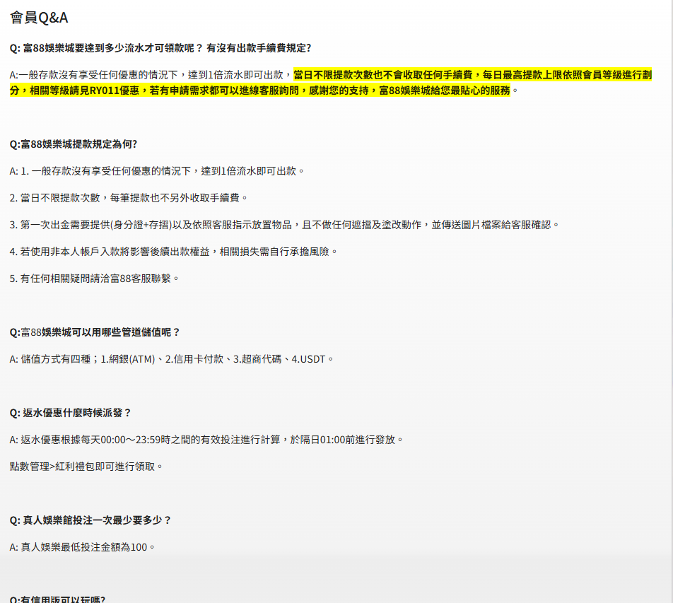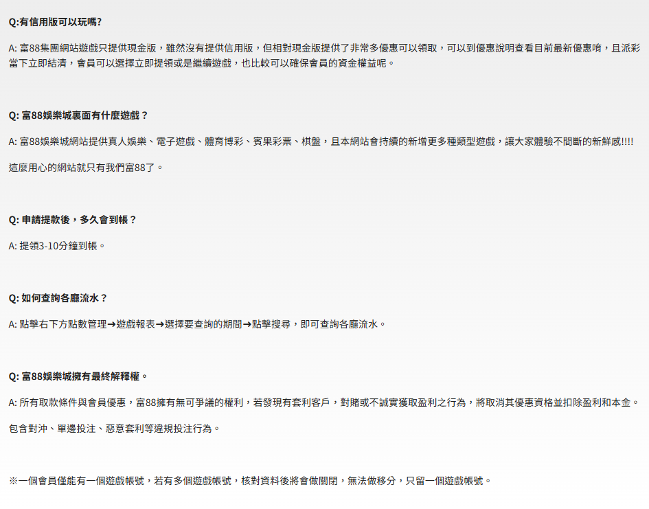 也正因如此,當我接觸富88娛樂城後,看到他們有一份公開透明的會員Q&A,我覺得非常加分。這份Q&A幾乎涵蓋了每個新玩家可能遇到的問題,而且回答清楚、條件明朗,甚至還比其他平台更彈性。