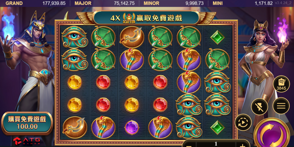 進入遊戲後,我們會看到一個6×5的轉輪畫面,畫面上排列著各式各樣的符號,包括寶石、神眼、蛇、弓箭、綠鑽、以及金色武器。遊戲左側與右側分別站著戰神與女神造型角色,而最上方則顯示著 GRAND、MAJOR、MINOR、MINI 四種不同等級的累積獎池金額。