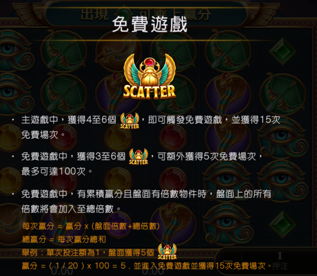 看到「SCATTER」金色聖甲蟲嗎?這就是觸發免費遊戲的關鍵符號。