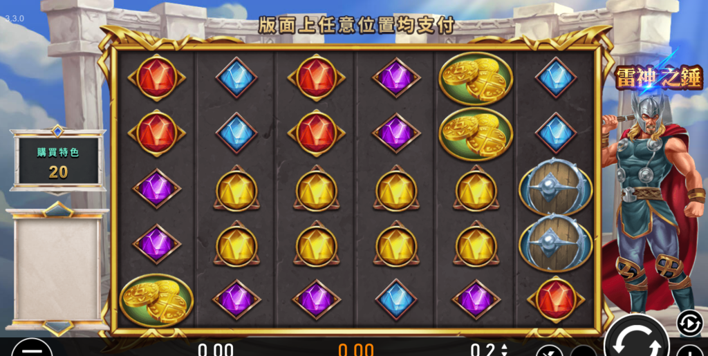 遊戲還內建了「購買特色」的機制,畫面左側有個明確的倒三角框,顯示你可以用固定代價直接觸發特殊功能,例如一次就進入免費遊戲階段。這種設計讓玩家可以更自主地選擇要慢慢轉慢慢等,還是用購買方式衝高爆擊的節奏。而且畫面在點選購買後,雷神會用動畫方式「開槌」,讓這種付費選擇也變得充滿儀式感,不會像某些遊戲那樣只是單純進入另一個畫面。
