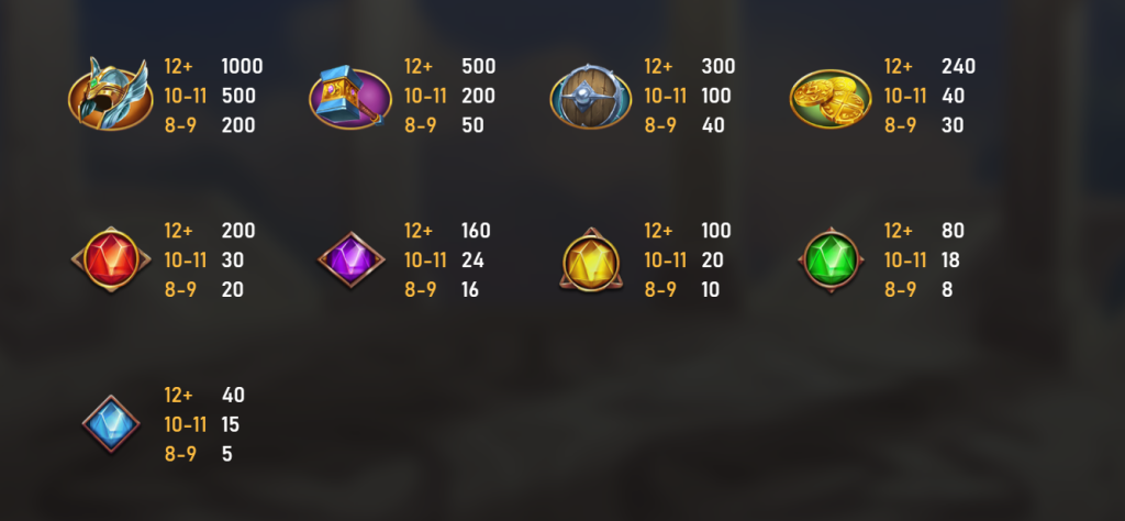 再來要認識的是幾個重要的圖案分類。這款遊戲的符號分成兩大類:一類是「低倍率圖騰」,像是紅、藍、紫、黃的寶石,這些雖然獎金不高,但出現機率高,很適合前期暖身;另一類則是「高倍率圖騰」,像是金幣、盾牌、雷神之槌,這些圖案如果湊齊,獎勵會非常驚人。不過它們出現率偏低,所以我們在初期玩的時候,建議不要太貪,一開始可以先從觀察這些圖案的分布頻率下手。