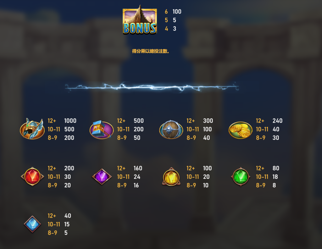 接著你會發現,畫面中出現的符號有很多種類,從戰錘、盾牌、金幣到各色寶石,每一種圖案都對應著不同的賠率。像是雷神的武器圖案,一次出現12個以上就能拿下高達1000倍的報酬,而即便只出現8~9個,也還有200倍可拿,這對於爆擊玩家來說無疑是一大誘惑。而一些顏色寶石(紅、紫、綠、藍)則是低倍率符號,主要是用來構成消除鏈反覆連線,雖然單價不高,但若觸發連鎖效應,也能打出不錯的總分。