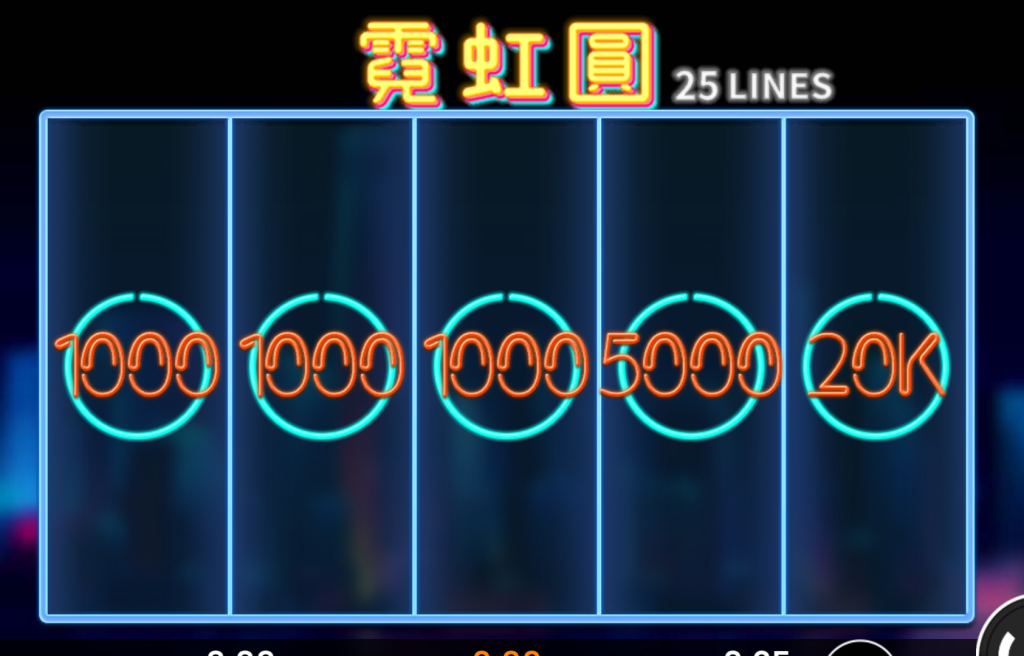 遊戲採用25條固定賠線設計,不同於傳統圖像連線,《霓虹圓》將數字符號本身作為核心玩法。像圖片中出現的 1000、5000、20K,正是玩家可直接獲得的獎勵倍數,這種直覺式顯示我認為非常適合想要快速爽感、追求直接爆擊的玩家。
