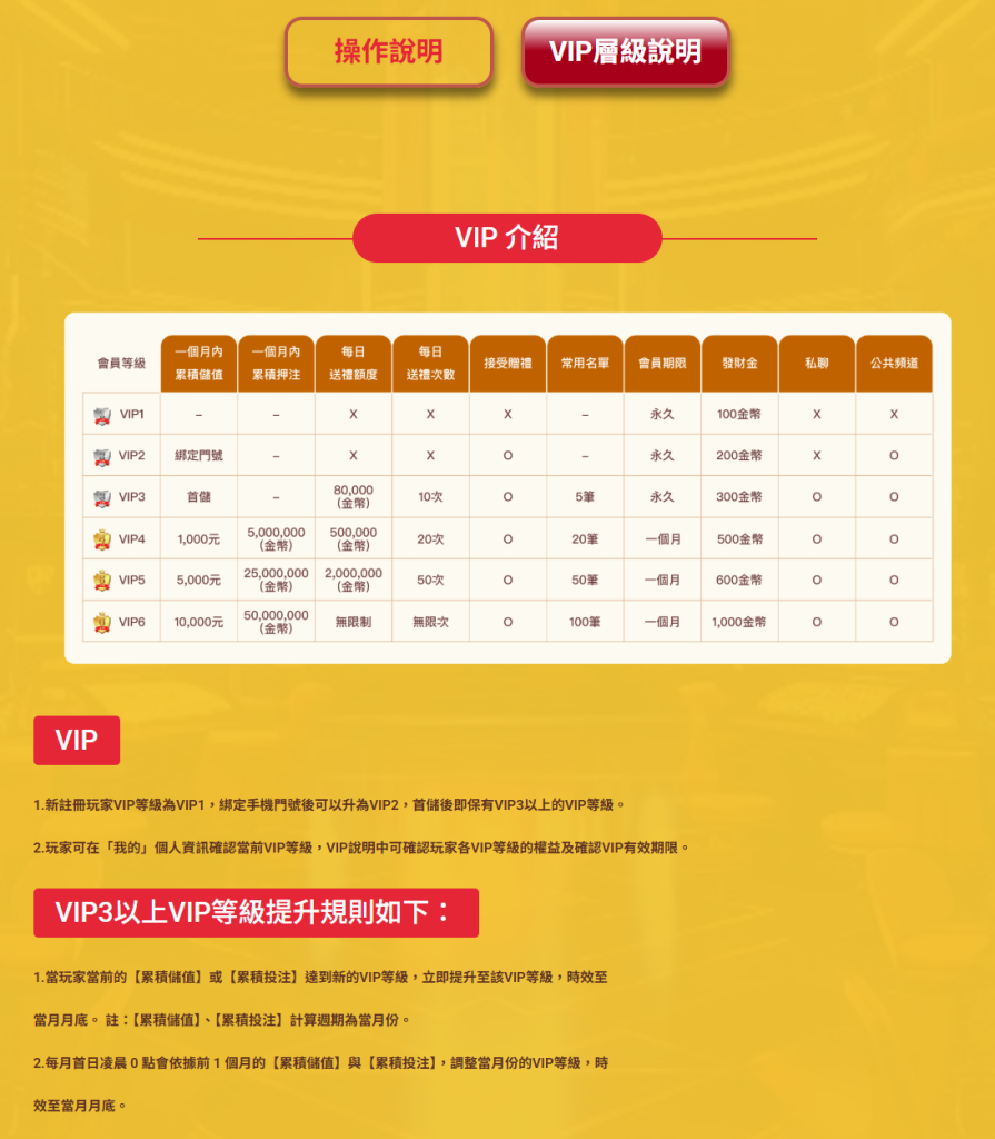 - 會員效期:VIP3為永久制,VIP4以上則需每月維持消費與押注標準,否則會於月底降級。
