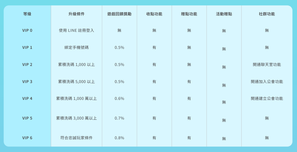 雖表列「符合忠誠玩家條件」即可升級VIP6,但若缺乏明確門檻,可能導致玩家無所依據,影響長期參與意願。建議可設計「申請制」或提供審核說明,提升制度信賴感。
