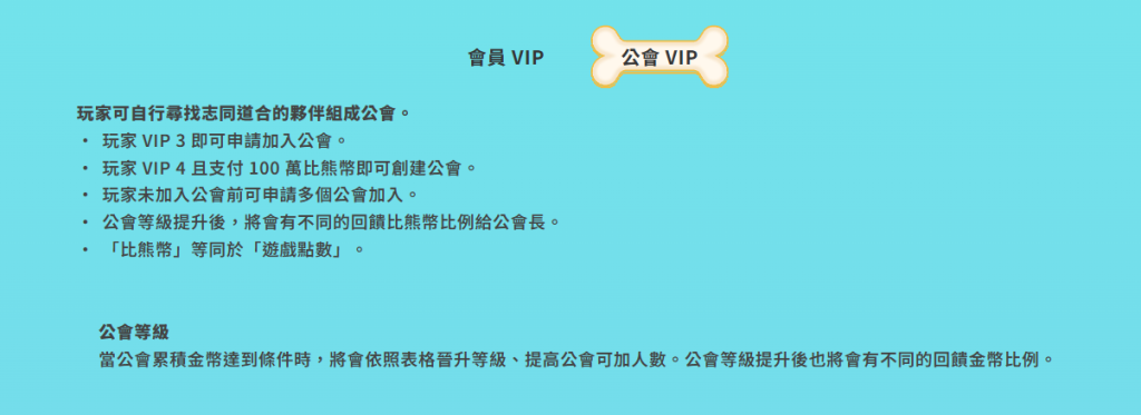 除了個人VIP制度外,小熊娛樂城另設有「公會VIP制度」,鼓勵玩家自組公會,並透過累積貢獻與公會金流進行升級。玩家從VIP 3起可申請加入現有公會,VIP 4且支付100萬點數則可創立新公會。此制度延伸了傳統VIP的概念,讓整體機制更具社交導向與團隊競技性。