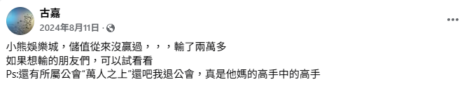 從社群媒體截圖來看,網友在FB公開留言:「小熊娛樂城,儲值從來沒贏過,輸了兩萬多,如果想輸的朋友們,可以試看看。還有所屬公會萬人之上還叫我退公會,真的是高手中的高手。」這段發言本身帶有強烈情緒色彩,但其核心訊息值得注意。