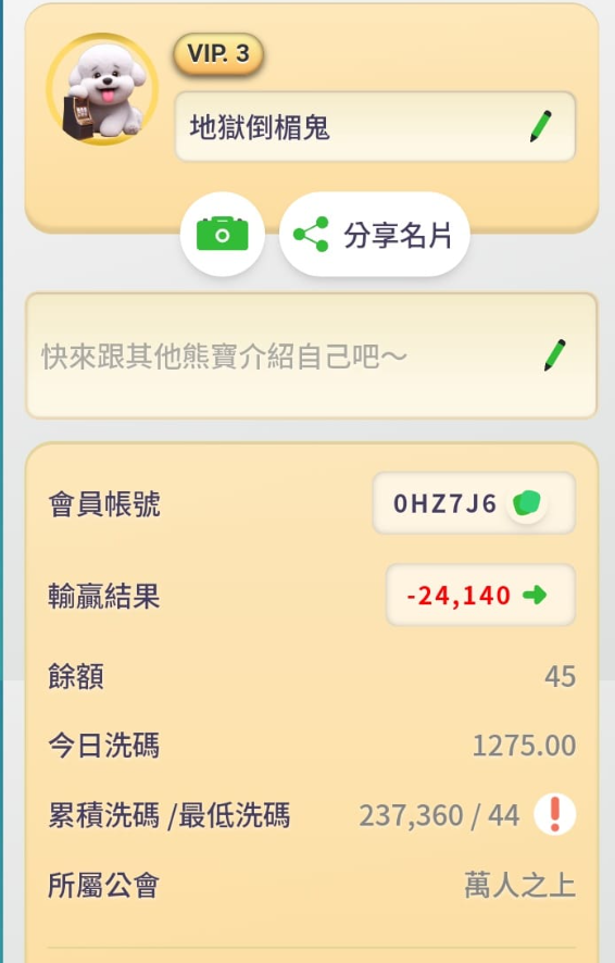進一步觀察會員中心截圖,可以發現受訪玩家等級為VIP3,暱稱「地獄倒楣鬼」,。輸贏結果-24140,餘額僅剩45,今日洗碼1275,累積洗碼高達237360(門檻/最低洗碼44)。所屬公會為「萬人之上」。
