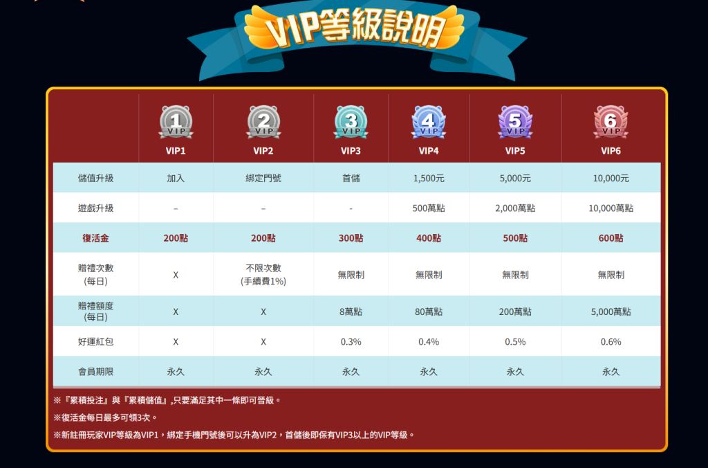 在最基礎的VIP1等級,只要註冊成功即可獲得,屬於平台的「入門會員」。這個等級沒有任何儲值門檻,但仍享有每日最多三次的「復活金」申請權,每次可領取200點。這對新手玩家來說是一種容錯設計,即便失誤或體驗不佳,也可透過復活金稍作彌補,延長遊戲時間,增加使用者首次體驗的容忍度與回訪率。