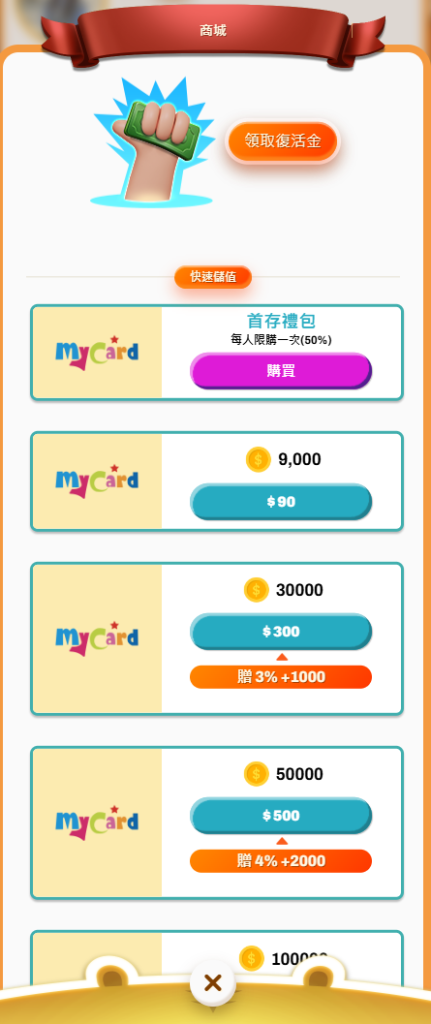 從圖片可見,玩家進入「商城」頁面後,即可看到MyCard儲值區塊,設計上清楚標明了幣值與價格對應關係,並標示出每一筆儲值是否附加額外贈點。例如: