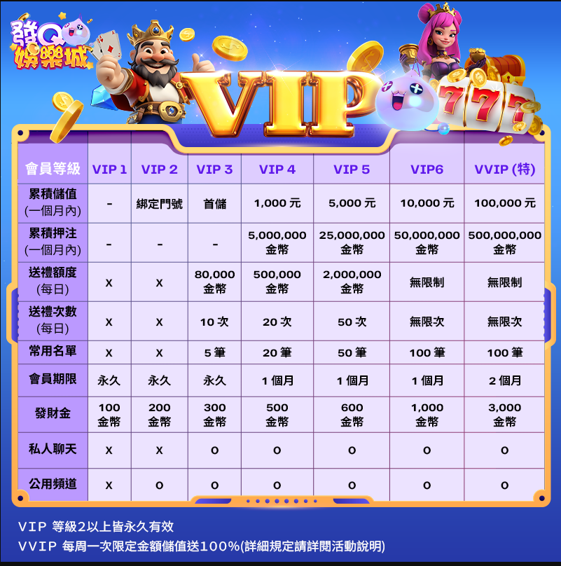 發Q娛樂城的VIP制度並非單純回饋金幣,而是從多個層面提供不同程度的福利,包括每日送禮、好友名單數、私聊功能、頻道使用與平台公會資源等。