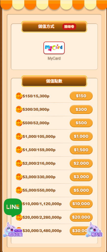 MyCard是目前發Q娛樂城主推的儲值管道之一。從介面設計可見,不僅提供從150元到30,000元不等的金額儲值,還搭配相應比例的「點數加乘」。例如儲值150元可獲得15,300遊戲點,等於原始金額的1.02倍;而儲值30,000元更可拿到3,480,000點,換算倍率仍維持在合理的高回饋水準。