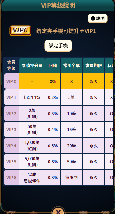 這套制度的門檻設計採用漸進式累積,讓新手玩家能夠藉由小額參與逐步晉升,亦讓高頻玩家能因長期投注獲得實質回饋與專屬待遇。特別值得注意的是,VIP等級一旦升級後,系統標示為「永久」,不需每月重新達標才能保有等級,這對於遊玩頻率不穩定或中斷後再回歸的玩家而言,是一大人性化設計。
