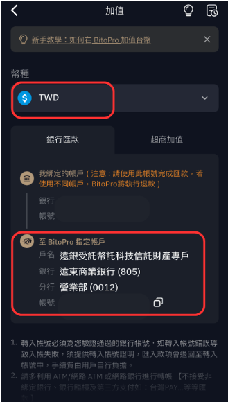 在這裡,你會看到加值選項,點擊進入,選擇新台幣(TWD)作為入金貨幣。平台提供多種方式來充值TWD,包括透過銀行匯款或超商繳款。如果選擇銀行匯款,系統會提供專屬帳號,你只需複製帳號,完成轉帳操作後等待款項入帳。