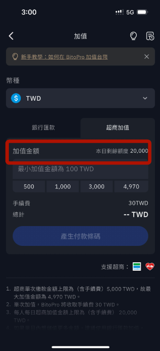 在選擇了「超商繳費」後,輸入您想加值的金額,系統會自動顯示對應的手續費以及總金額。例如,如果您輸入1,000TWD,加上30TWD的手續費,總金額將是1,030TWD。確認金額無誤後,點擊「下一步」,系統將生成專屬條碼。