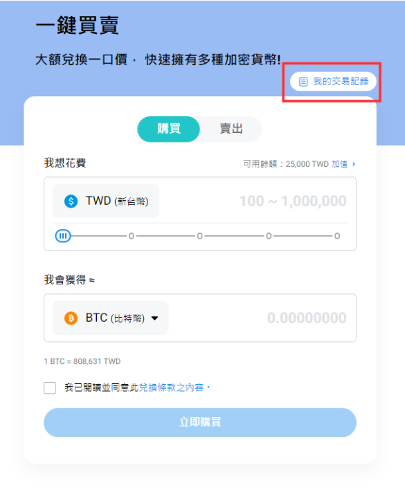 使用BitoPro的一鍵買賣功能完成交易後,在BitoPro平台中,點擊進入「一鍵買賣」主介面,您會看到買入和賣出的選項,並可以選擇相關的幣種與金額。在主頁面的右上角,會有一個按鈕標示為「我的交易紀錄」,這是進入交易明細的快速入口。