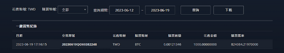 在主介面中,點擊 「我的交易紀錄」 按鈕後,系統會自動跳轉到紀錄頁面,為您列出近期的所有交易明細,在交易紀錄頁面,您可以根據需求調整查詢範圍,例如選擇特定日期區間來檢視某段時間內的交易。同時,BitoPro還提供下載功能,讓您將所有交易紀錄以檔案形式保存,用於個人財務管理或報稅參考。